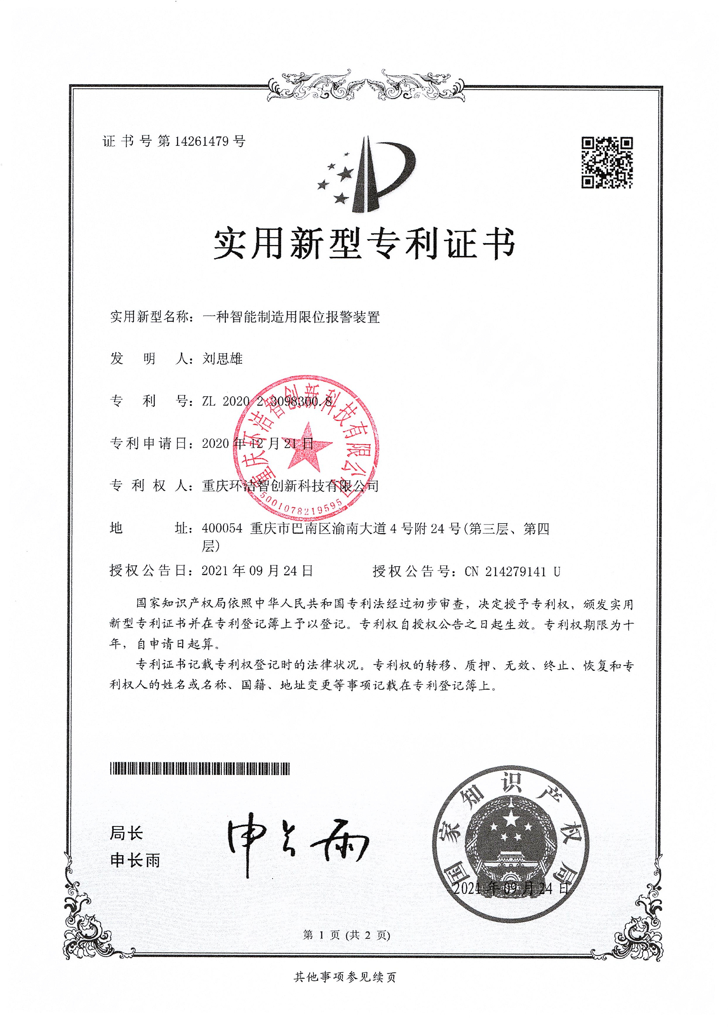 恭喜下發(fā)一種智能制造用限位報警裝置實用新型專利證書